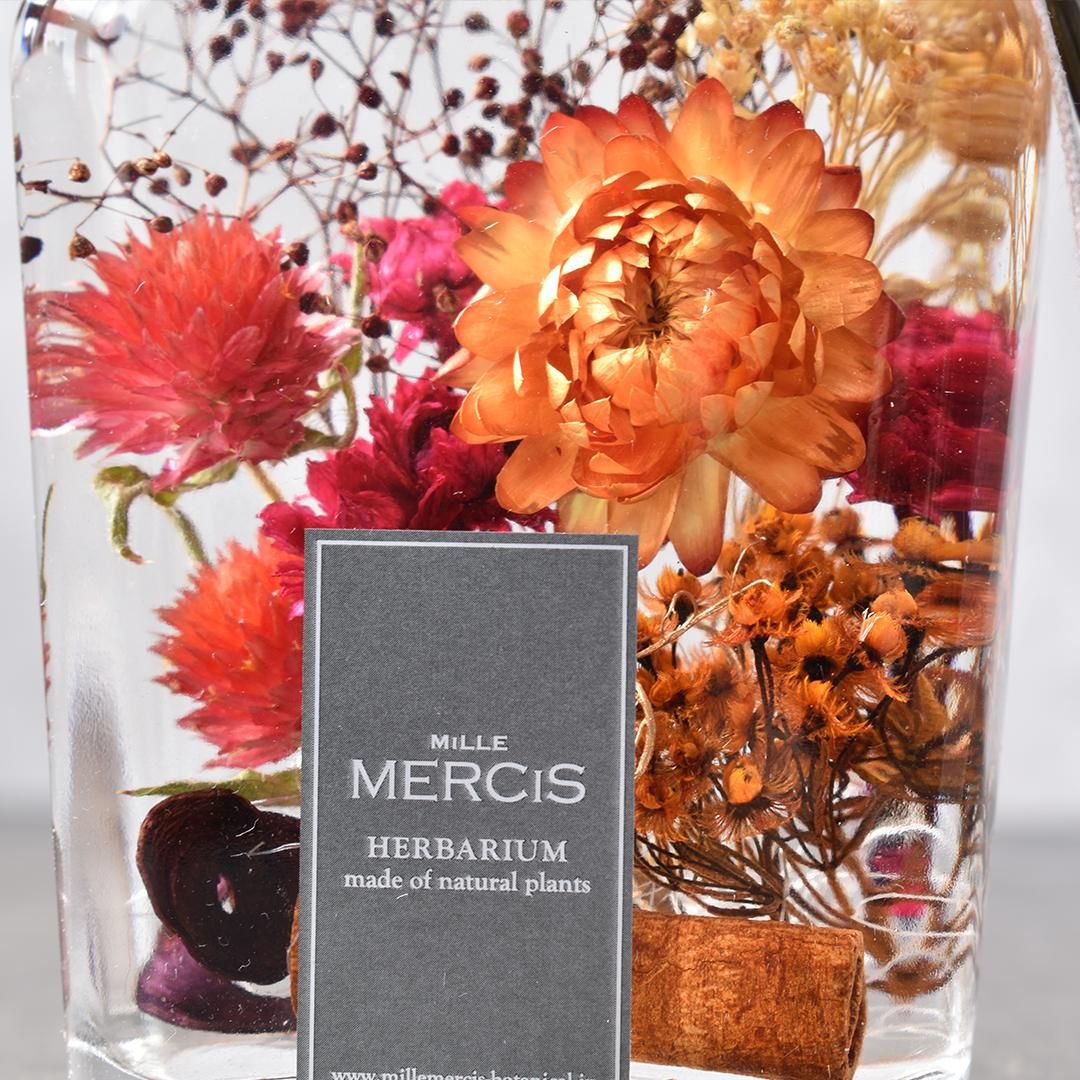 SOLD OUTハロウィン限定★赤い千日紅に黄赤のヘリクリサムをあわせ、赤と黄色のグラデーションでハロウィンカラーを表現したモダンな印象のハーバリウムです。「Happy Halloween」と書かれたハロウィン限定タグに、アンティークなお化けかぼちゃのチャームがついています。