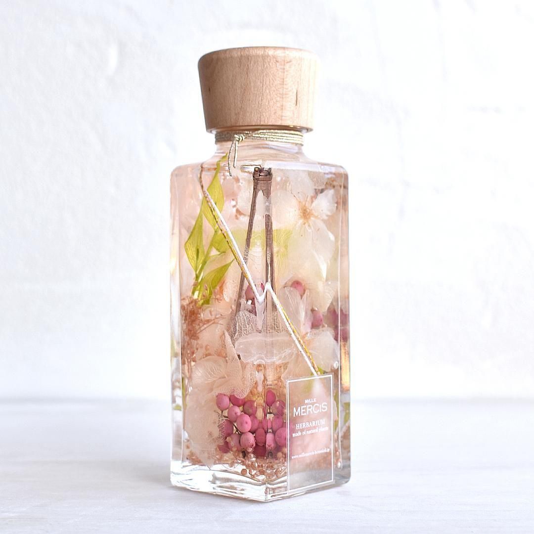 素材 | 容器:ガラス キャップ:アルミニウム ・木材(メープル) 花材:ドライフラワー、シリコンオイル |